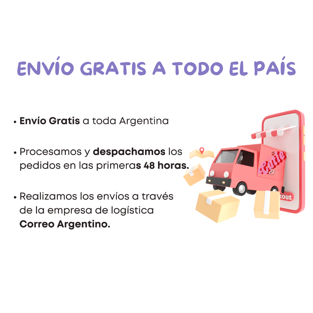Todos los pedidos se envian en un plazo de 48 horas habiles mediante correo argentino. El plazo de entrega suele ser de 4 a 5 dias habiles, sin embargo puede recibir sus articulos antes.